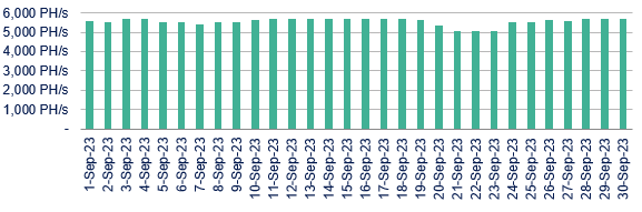 The project achieved average monthly operating hashrate of 1,617 PH/s in September compared to 1,615 PH/s last month.